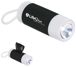 Extra Bright White LED Light. Twist Action Turns On/Off. Refillable Barrel Holds 25 Disposable Bags. Attaches To Leash, Belt Loop, Etc. Button Cell Batteries Included. Complies with Prop 65. 4" H